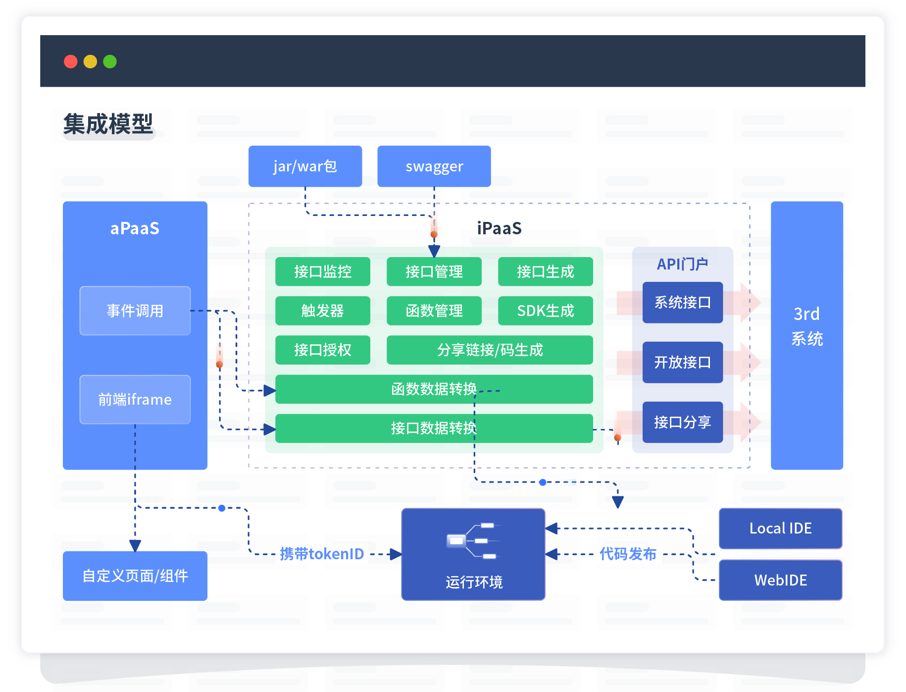 集成模型包括平台本身前、、后端能力的扩展,,也支持通过API门户和第三方系统进行交互。。