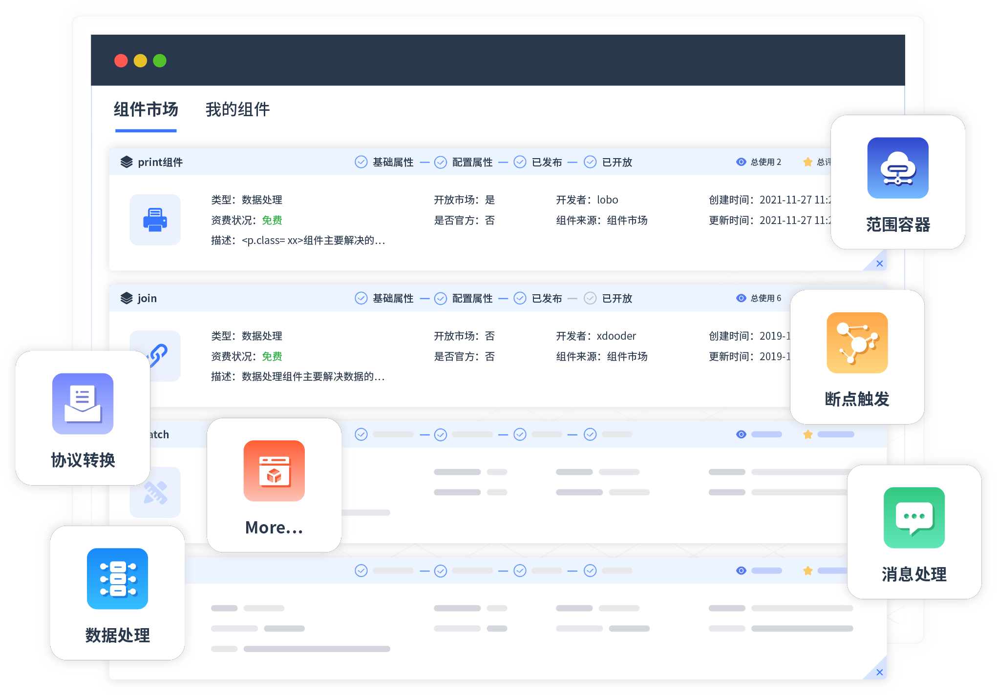针对集成场景,,,,钱能钱包提供组件市场,,,例如协议转换、、消息处理、、文件操作等。。。除平台提供的组件外,,,,客户可以自定义所需组件。。。