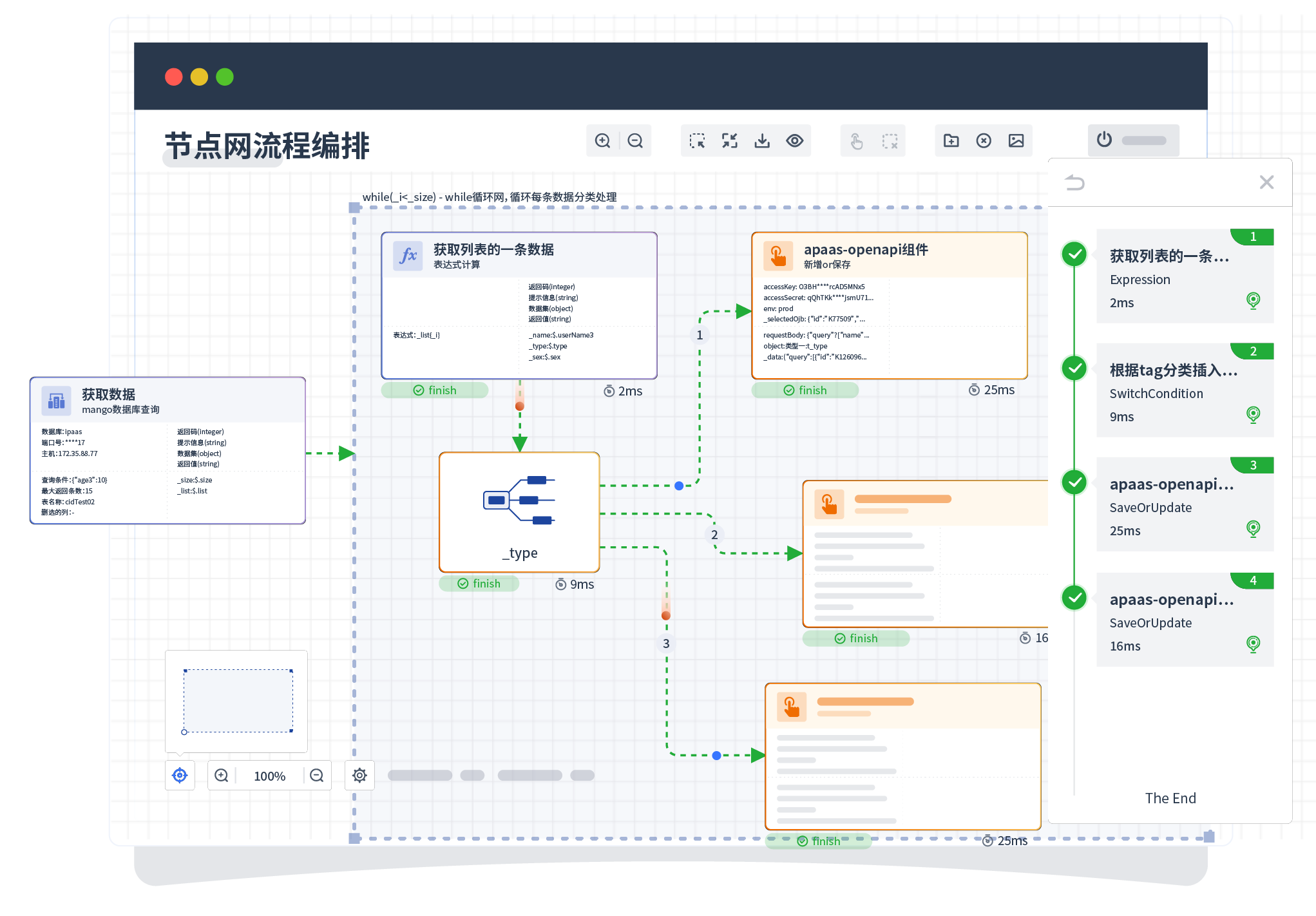 针对集成场景,,,,组件定义后支持进行流程编制,,,不同于传统代码方式,,,,通过图形化展示,,,,支持在线调试、、、、日志查看和运行回放。。。